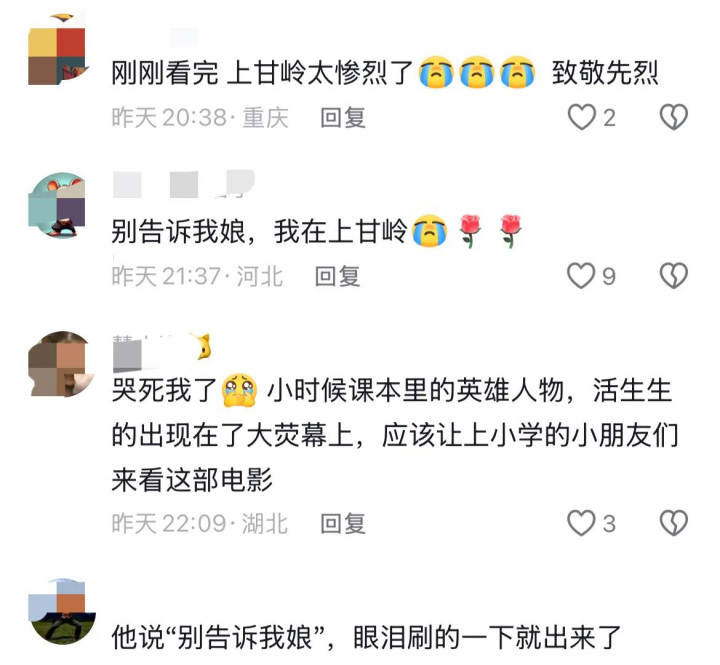 电影中,最让人触动的还是年仅21岁的黄继光牺牲的画面,一句“别告诉俺娘”,让很多观众再也绷不住了,青年演员周政杰的演技获得了众多观众的喜爱和好评,很好的诠释了这个人物,未来可期。